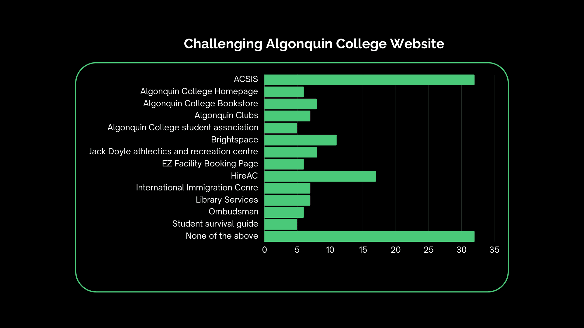 To understand the onboarding experience of new students at Algonquin College, we conducted a survey with 126 participants, narrowing our analysis to 99 first-year students for relevance. Among them, 52% were international and 48% domestic, offering a balanced perspective. Students primarily used the ACSIS platform (30%) for academic tasks like course registration and scheduling, while the main homepage and other services such as the bookstore or student clubs saw far less engagement. This indicates that students prioritize academic-related pages during onboarding and may lack awareness or access to non-academic tools.