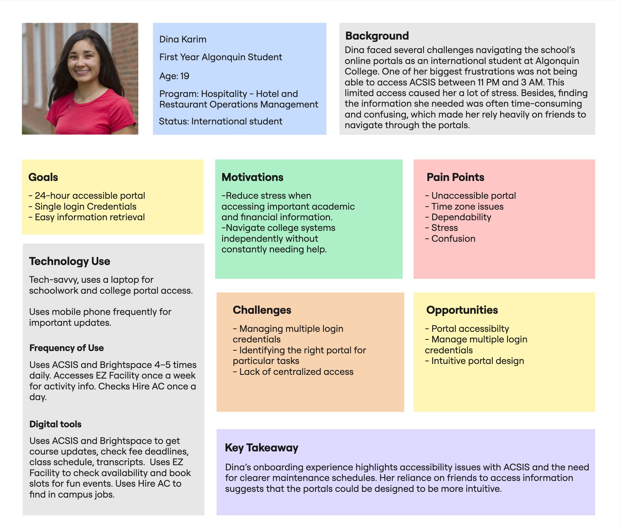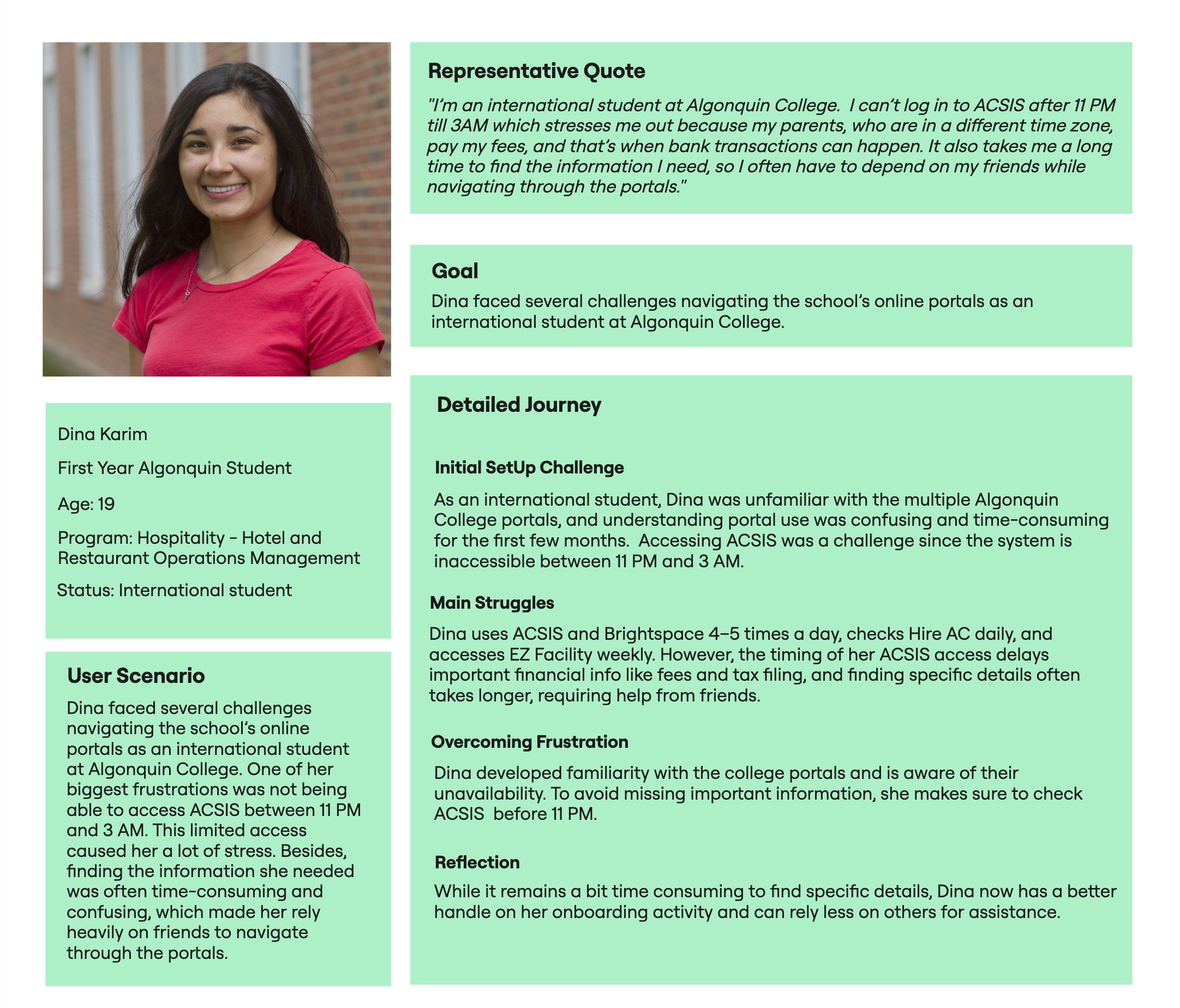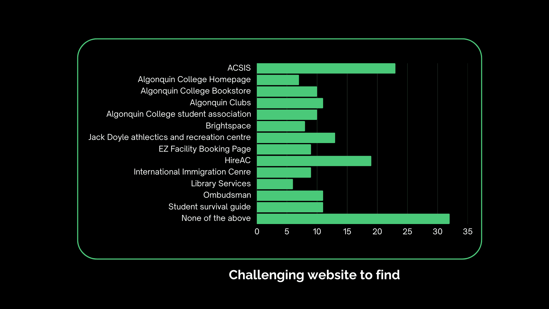 Our findings revealed persistent challenges with both discoverability and usability across key platforms. ACSIS and HireAC were the most difficult to find and navigate, while 33% of respondents cited multiple logins as a major barrier to effective website use. Although over half of the students found information access easy, nearly one-third remained neutral, and 11% reported difficulty. Overall, most students rated their onboarding navigation experience as fair to good, highlighting a functional but unremarkable journey. These insights underscore the need for streamlined navigation, consistent design, and clearer access paths to improve the student onboarding experience.