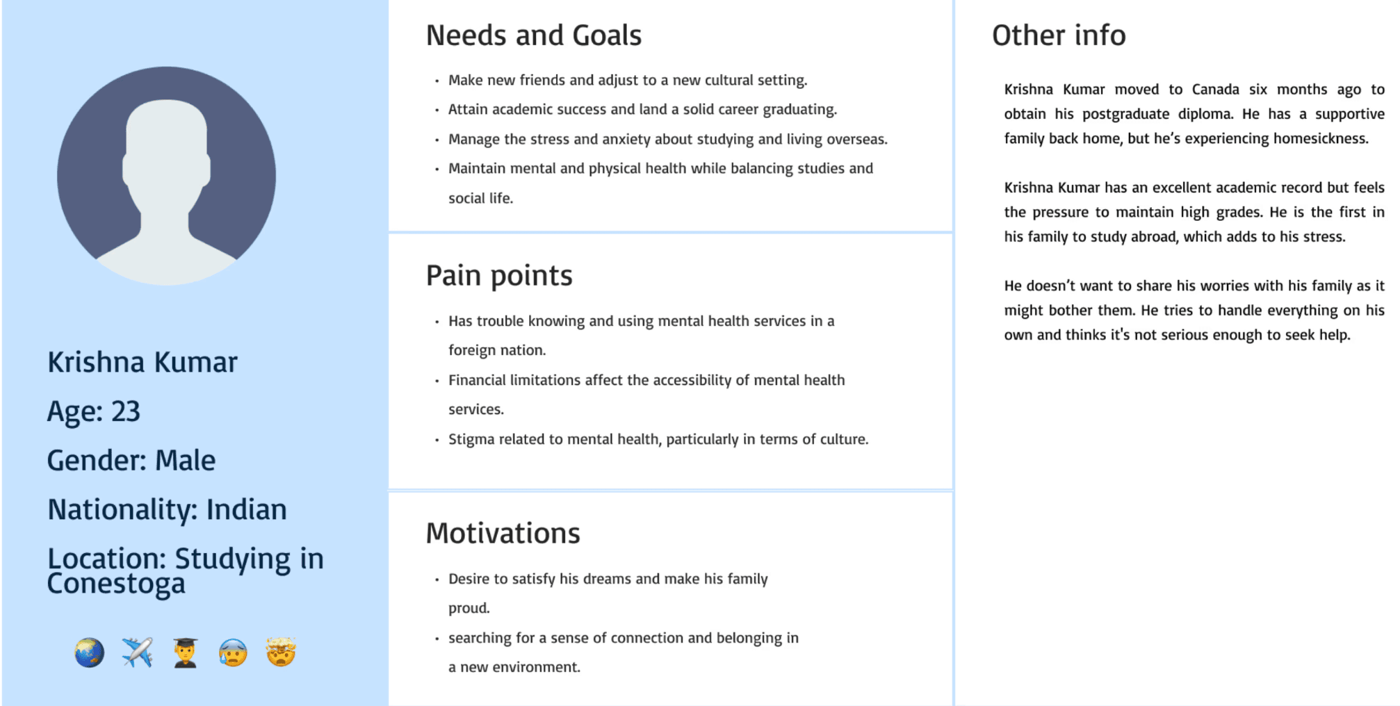 Significant Problem: Mental health for international students. International students are prone to mental stress due to their new living environment, cultural differences, and academic pressure. They might not get the required diagnosis and help as they might not know where and how to seek help.